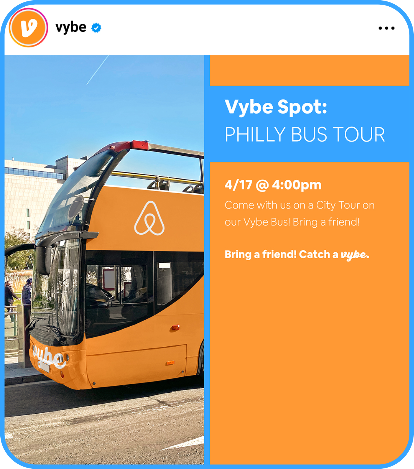 Vybe is a concept app designed to help Gen Z form real connections and friendships. It features curated meet-up spots, called "Vybe Spots," and integrates discounted stays with Airbnb. The app’s advanced matchmaking encourages self-expression and connection through shared interests.
